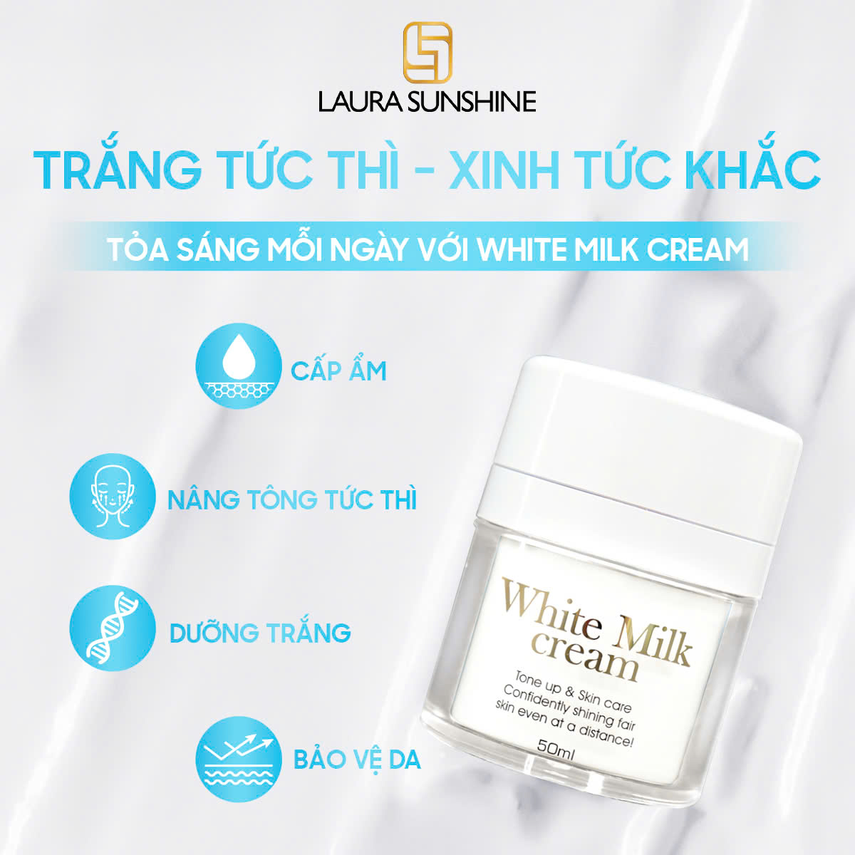 Laura Sunshine White Milk Cream – kem sữa dưỡng trắng da cao cấp, mang lại làn da trắng sáng, căng mướt và rạng ngời tự nhiên chỉ sau một bước chăm sóc.